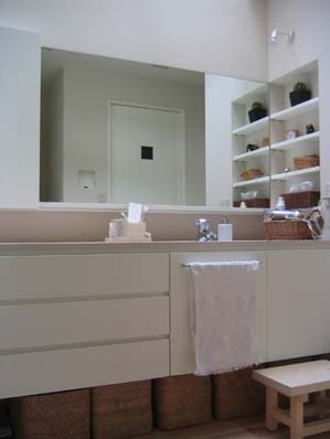 奥行きの浅いサイドニッチが、洗面小物の収納に役立ちます