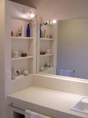 奥行きの浅い、棚は洗面周りの小物の陳列に便利。