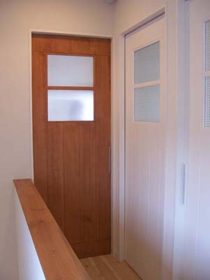 2階廊下。アンティーク色のドアと白塗装のドア。