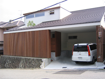 坂の上の住宅地に建つY邸。広く大きな木製のルーバーフェンスは、