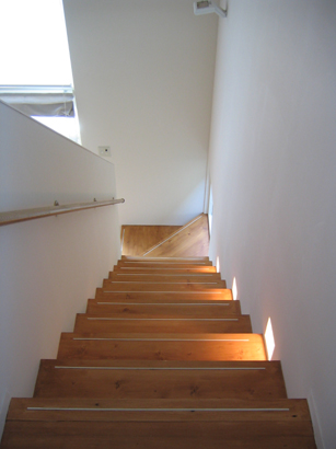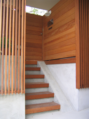 階段のステップも木製。耐久性の高いイペ材を使用しています。