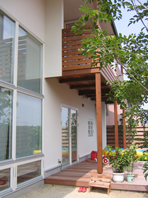 庭側のデッキ空間。こちらもイペ材を使用。イペ材は非常に固く、